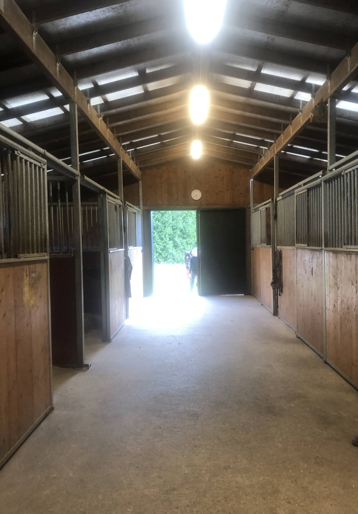 Här finns sex boxar, stora hagar, foderkammare, sadelkammare och plats för hö och strö.